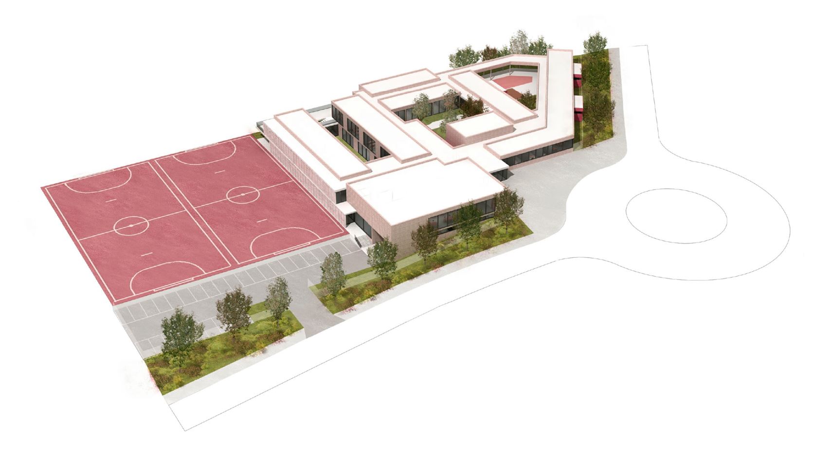 La implantación en la parcela busca un equilibrio entre la presencia hacia la avenida principal y la creación de un interior protegido para la actividad escolar. Así, el edificio se organiza en torno a patios centrales que funcionan como corazón del proyecto, proporcionando luz natural, ventilación cruzada y zonas de encuentro para los distintos grupos de edad. Cada patio se ha diseñado con una identidad propia, ajustada a los usos pedagógicos y recreativos de cada etapa educativa.