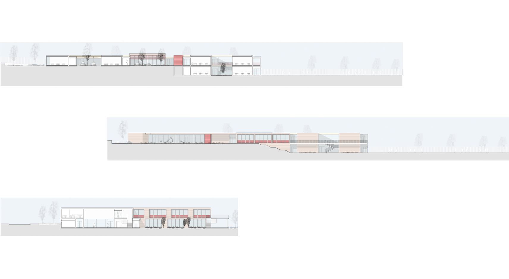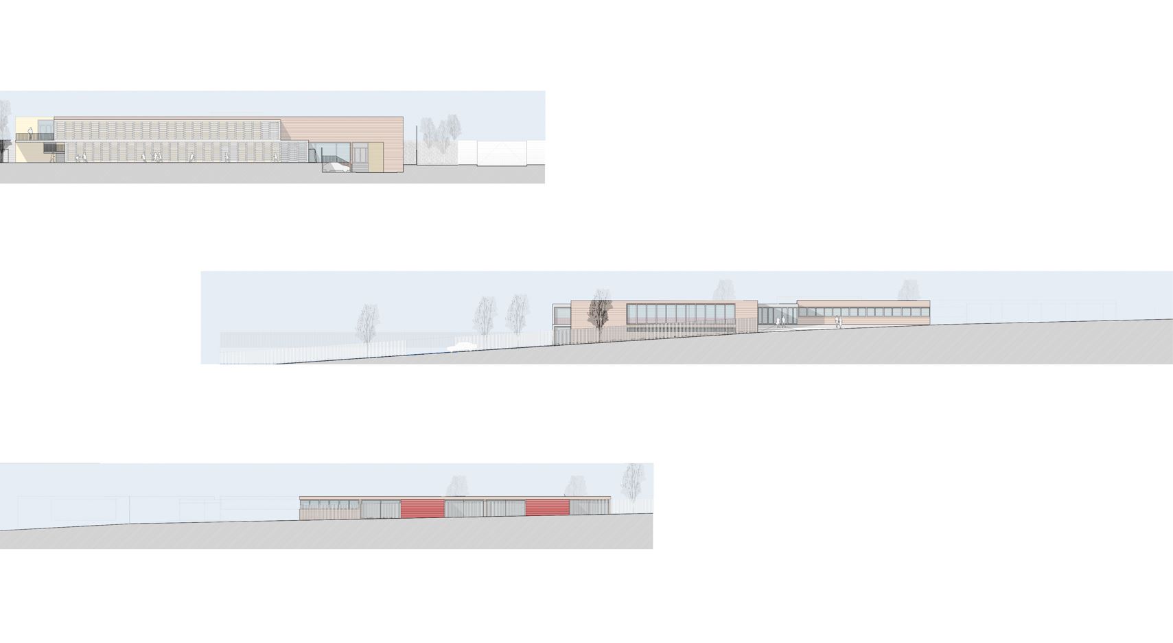 La mayor parte del programa se desarrolla en planta baja, lo que facilita los desplazamientos y la accesibilidad universal. Únicamente un conjunto de aulas de primaria se sitúa en un nivel superior, conectado mediante escaleras y ascensor, garantizando seguridad, accesibilidad y eficiencia en la evacuación.