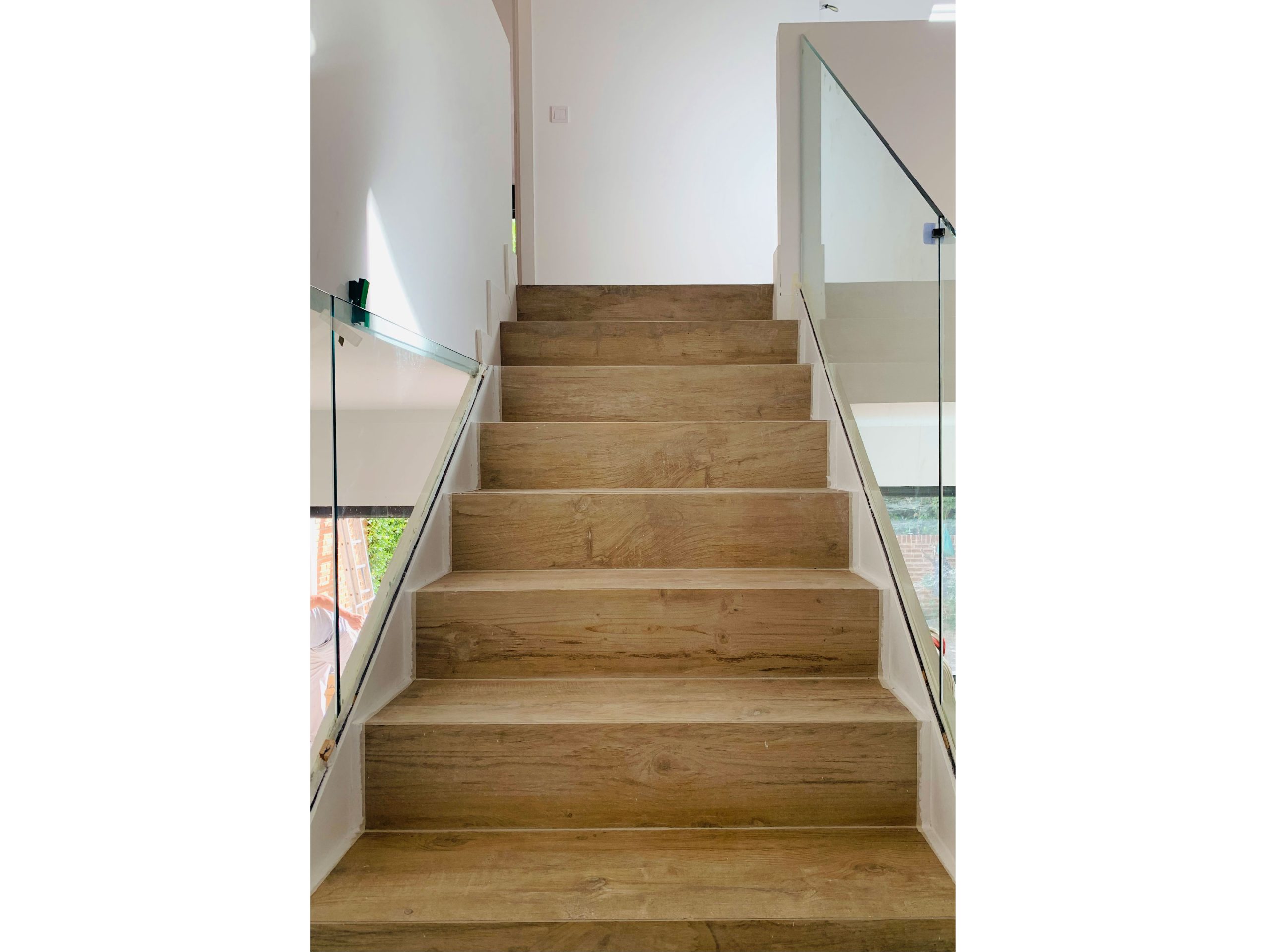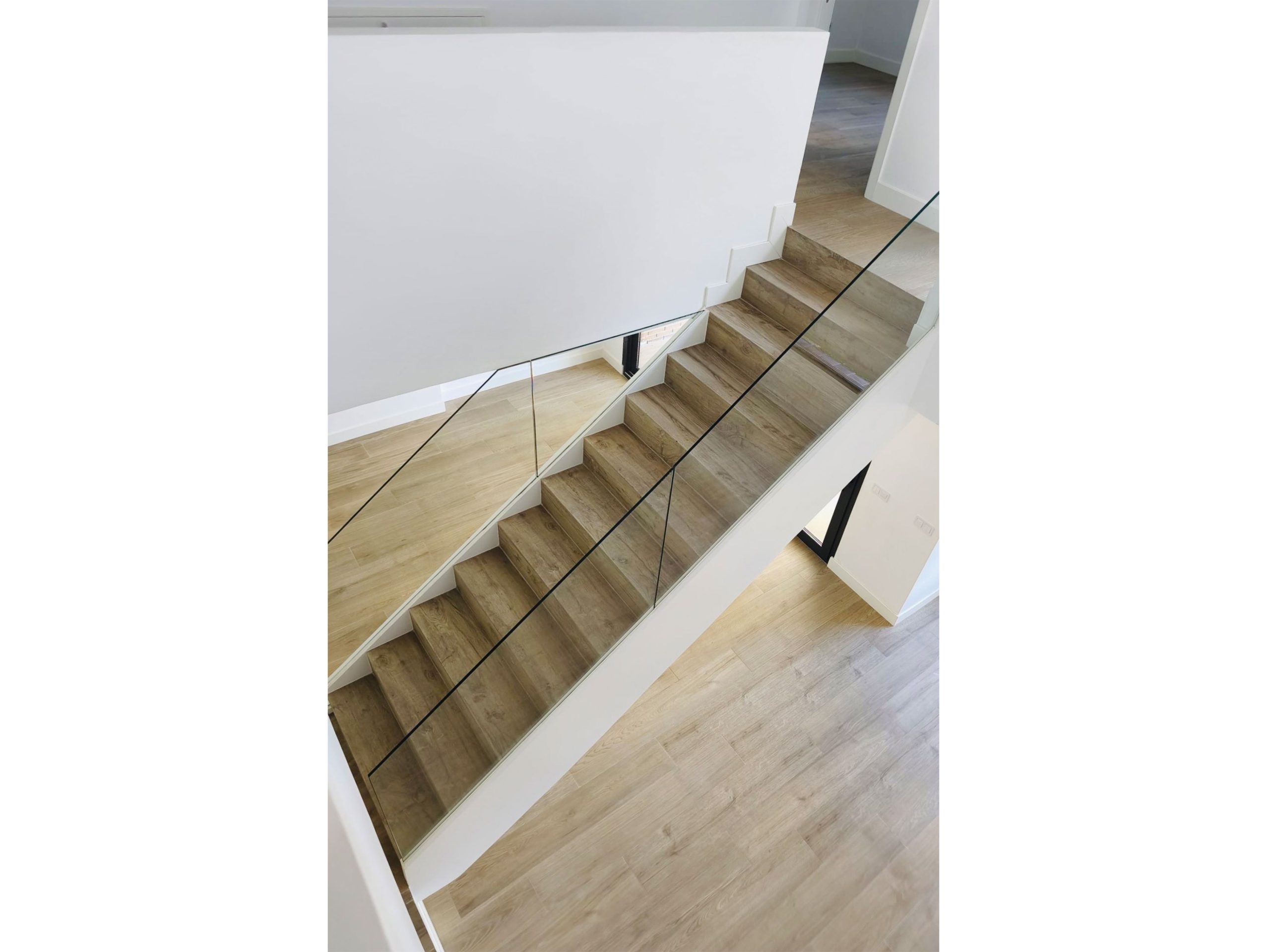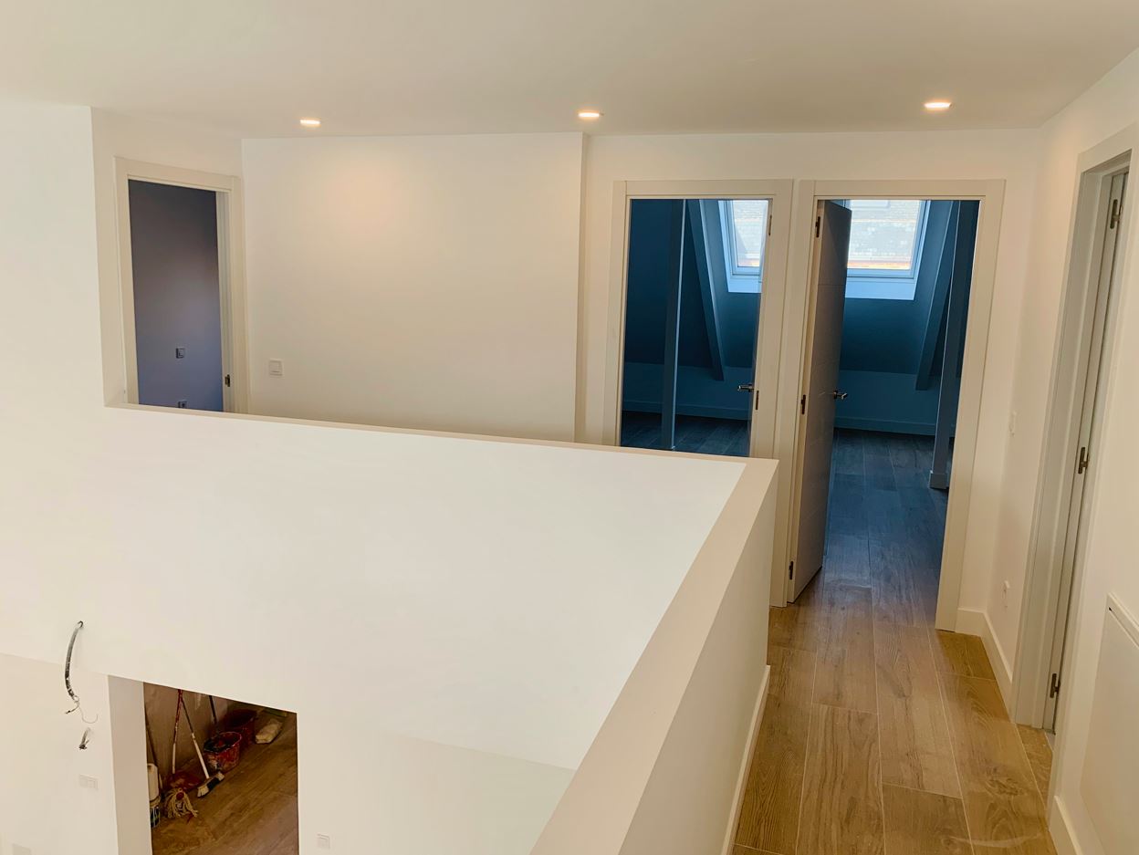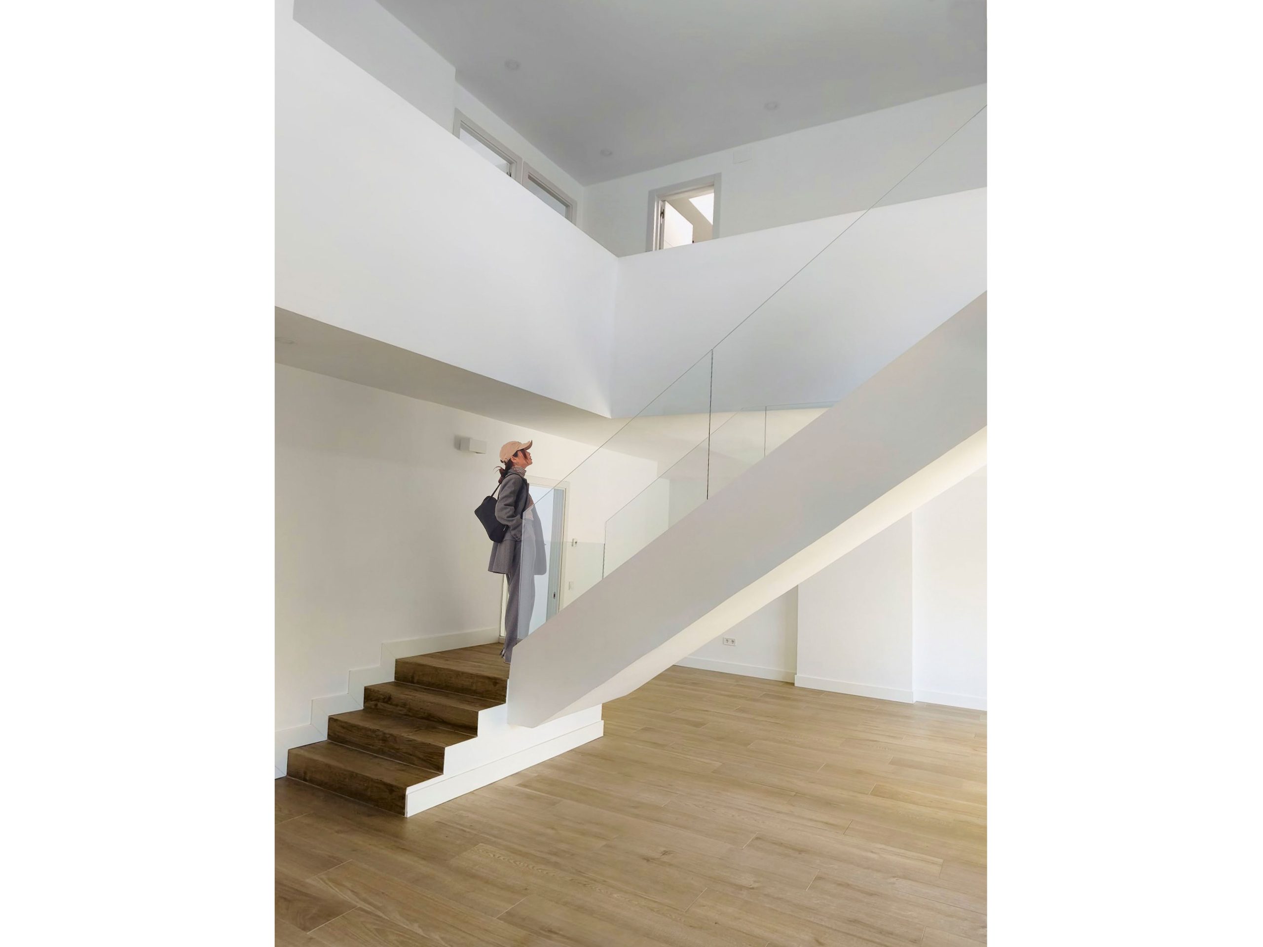 En el interior la actuación más relevante consistió en la remodelación del espacio de doble altura del salón, para lo cual se eliminó la chimenea existente y se rediseño la escalera, dotándola de mayor ligereza y transparencia, lo que permitía establecer una continuidad visual entre el salón y el comedor –y a su vez entre estos y el exterior, mediante el adecuado tratamiento de los huecos como se ha indicado- y generar un mejor aprovechamiento del espacio y una mayor sensación de amplitud.
